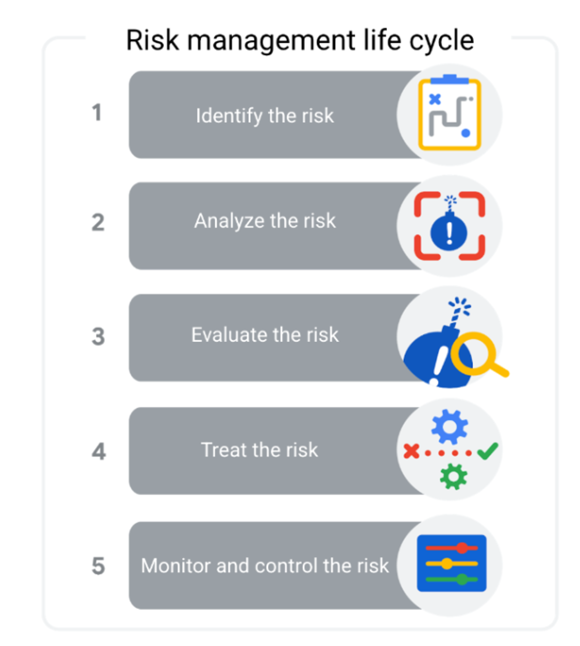 リスクマネジメントとは、プロジェクトに影響を及ぼす可能性のある潜在的なリスクや問題を特定し、評価するプロセスです。プロジェクトのライフサイクル全体を通じて継続的に実施され、一般的に次の5つのステップのいずれかが含まれています。