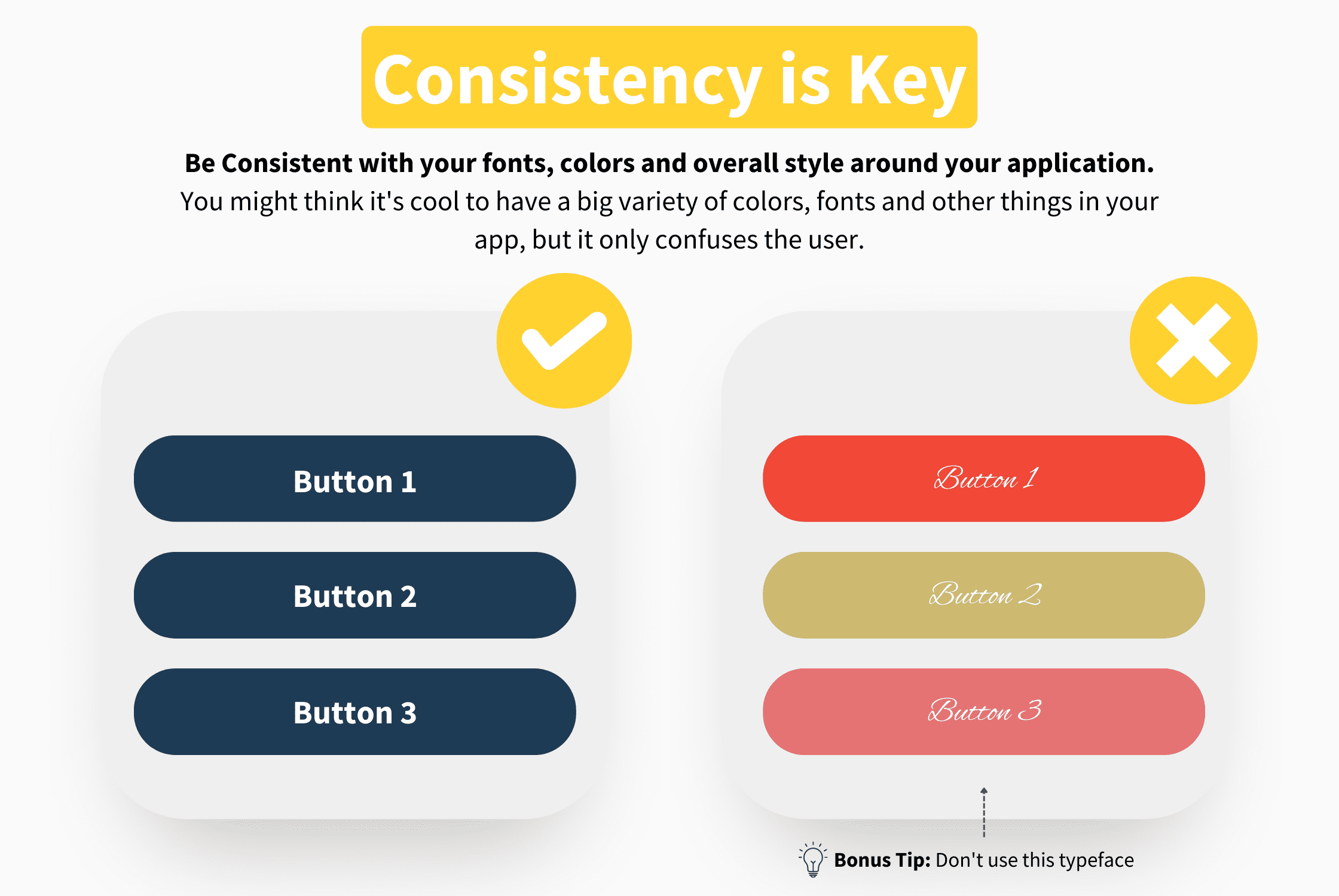 テキストの配置だけでなく、ボタンなどのインタラクティブな要素の一貫性も重要です。例えば、「保存」ボタンの色を全ページ緑色で統一することで、色で機能を理解し、ユーザーは迷わず操作できるようになります。